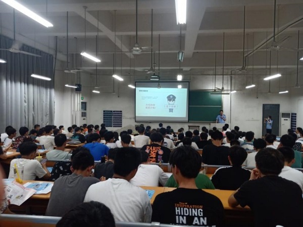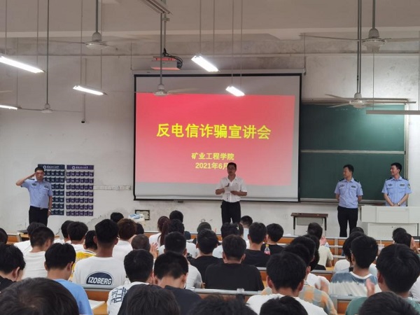 6月29日晚,在天工105教室,精东影业 邀请淮南市公安局山南新区分局丁锐、郑宇等4位警官,为同学们作了“反电信诈骗”专题报告会。学院各年级200余名学生代表聆听报告。报告由学院党委副书记张向林主持。