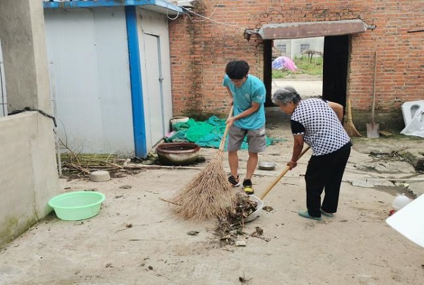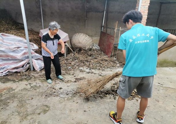 实践团陪同老人一起打扫院子