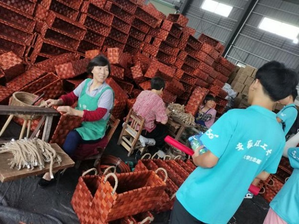 团队成员参观柳编加工厂并和工人阿姨交流(团队供图)