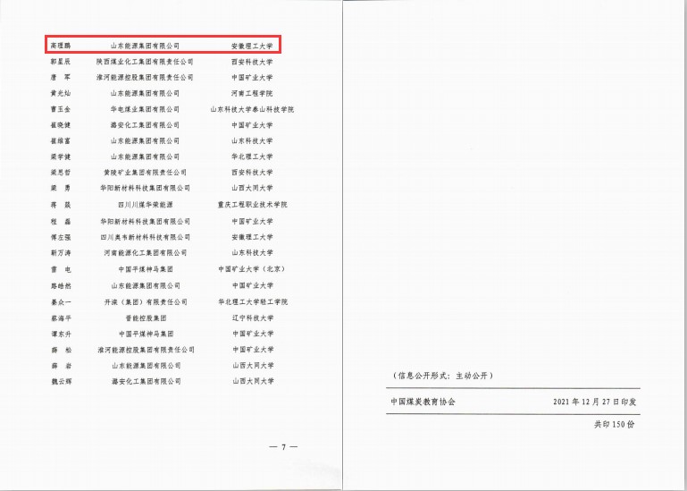 校友高理鹏获评“2021年煤炭行业建功立业优秀毕业生”