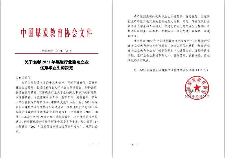 近日,中国煤炭教育协会下发《关于表彰2021年煤炭行业建功立业优秀毕业生的决定》(中煤教协[2021]34号),经中国煤炭教育协会评审专家委员会审定,精东影业 采矿工程12级校友高理鹏获评“2021年煤炭行业建功立业优秀毕业生”。