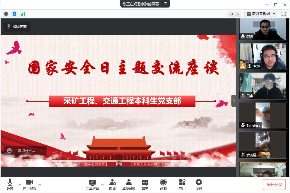 采矿工程、交通工程本科生党支部举办国家安全日主题座谈会,与会人员观看了宣传“国家安全及反有组织犯罪”的动画短片,并针对宪法和《国家安全法》《反分裂国家法》《网络安全法》等国家安全相关法律开展专题学习宣传。随后,参会党员结合自身实际,围绕国家安全、国家安全教育、师生思想政治工作、学校安全管理等主题进行了热烈的讨论和交流发言,从不同的角度发表了自己对国家安全、国家安全教育的理解和认识。大家一致认为,国家安全就在自己身边,作为一名新时代的大学生党员,要有责任担当意识,不断增强国家安全意识,成为国家安全的践行者、传播者和守护者。