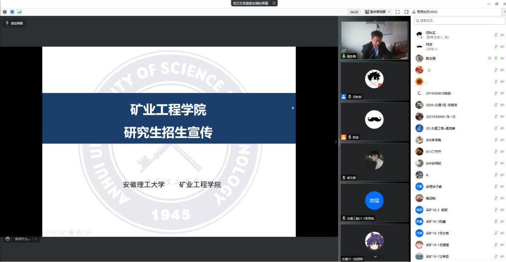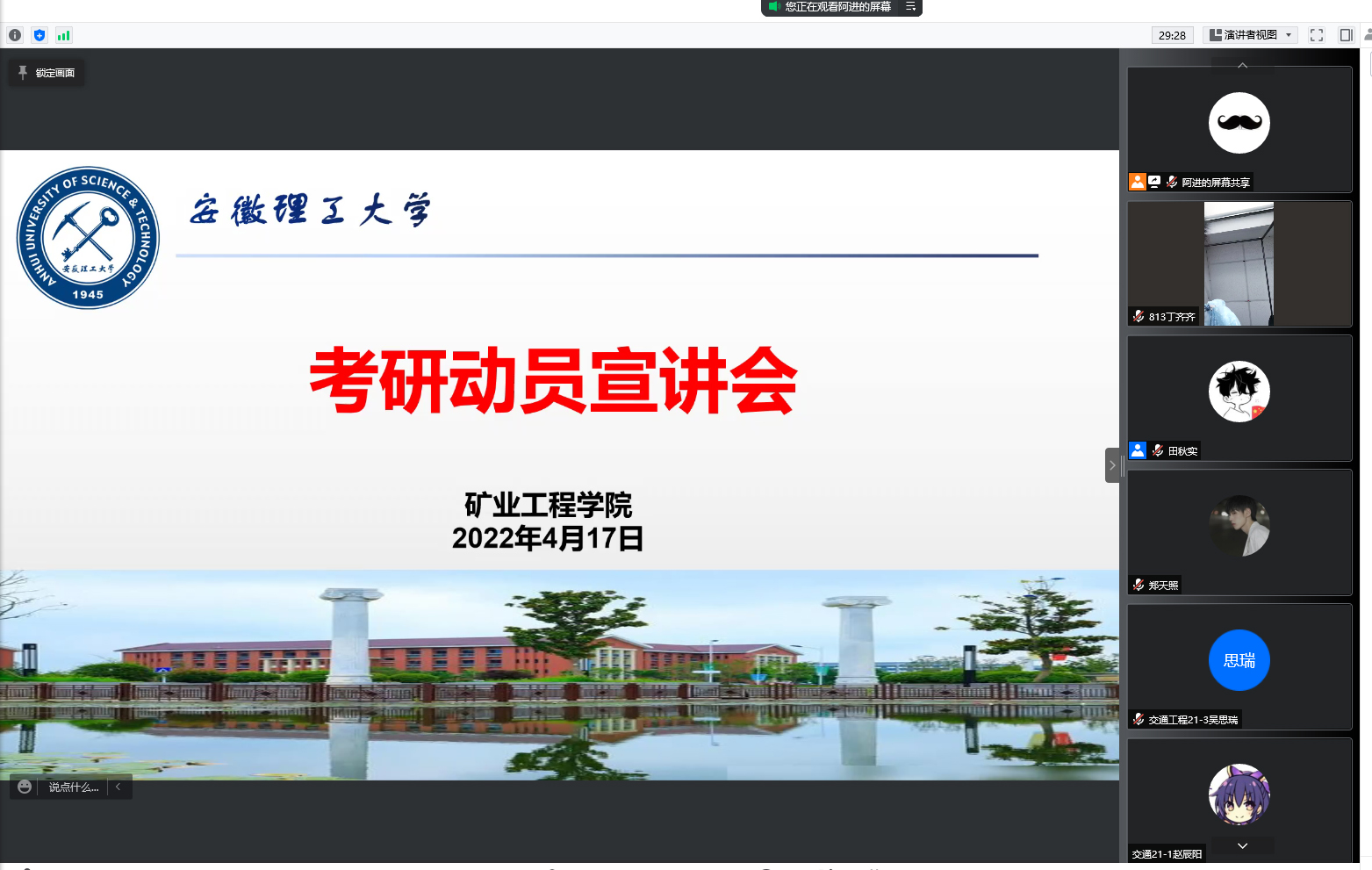 “古之立大事者,不惟有超世之才,亦必有坚忍不拔之志。”考研逐渐成为越来越多大学生的选择,为帮助同学们明晰考研形势,把握备考节奏,4月17日上午,精东影业 组织召开线上考研动员宣讲会。学院院长杨科、副院长殷志强、全体辅导员以及各年级学生400余人参加会议。党委副书记田秋实主持会议。