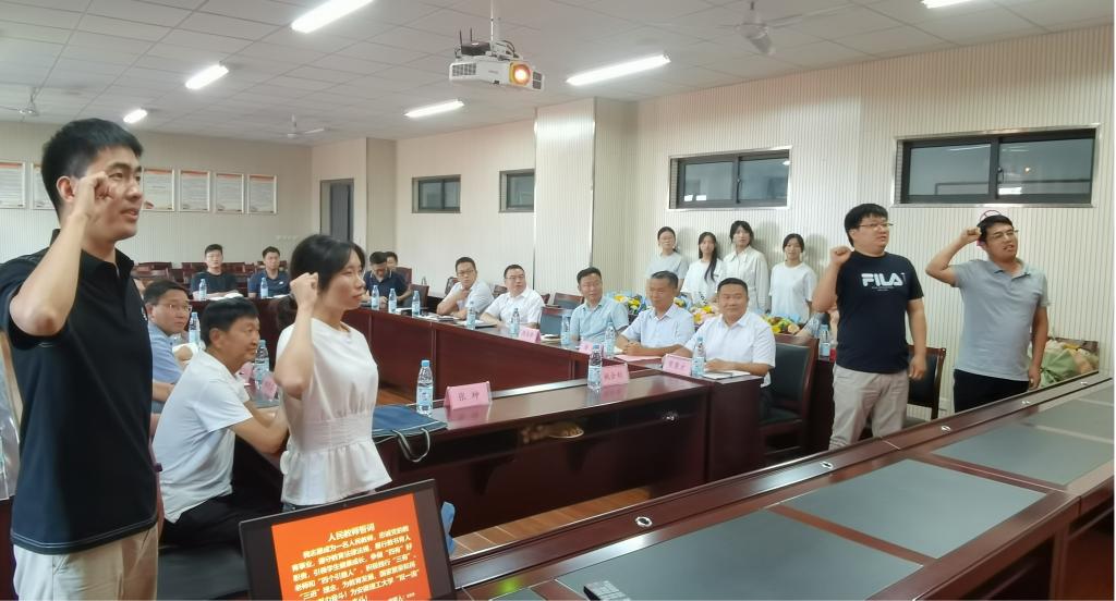 “我志愿成为一名人民教师,忠诚党的教育事业,遵守教育法律法规,履行教书育人职责……”学院4位新入职教师张洁斐、顾厚煜、王占棋、阚吉亮庄严宣誓。一句誓言,一份担当,4位青年教师表示将把誓词作为自己的行为准则,牢固树立“躬耕教坛,强国有我”的志向与抱负,迅速适应从学生到教师的角色转换,多向有经验的老师虚心请教,不断提升专业素养和教育教学水平,争做“四有”好老师和“四个引路人”,为学校和学院发展贡献力量。