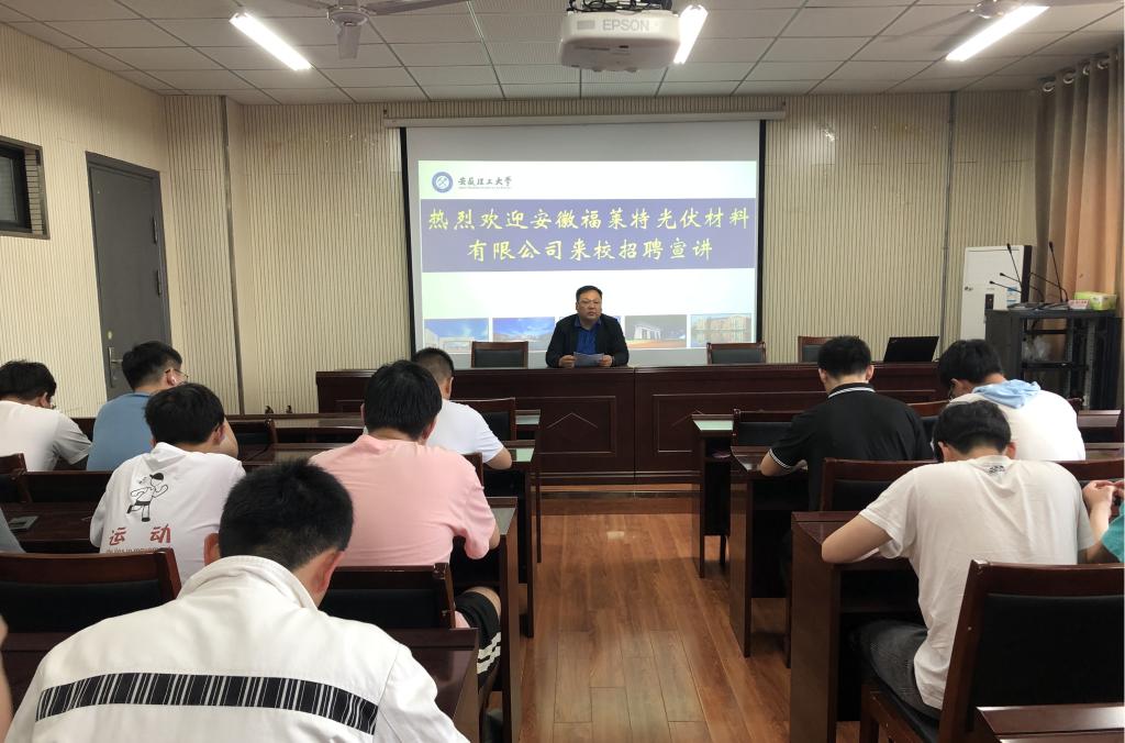 4月18日下午,安徽福莱特光伏材料有限公司董事长时志军一行到精东影业 开展交流并开展专场招聘宣讲。双方在宁远楼A406会议室进行交流座谈,就业创业指导中心、精东影业 主要负责人参加座谈。
