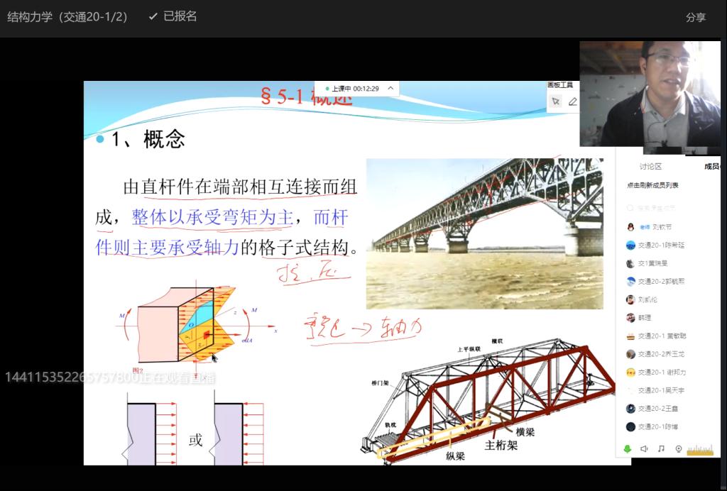 《结构力学》是理论讲解性课程,注重课程思政的融入。刘钦节老师以静定平面桁架结构为主要内容,通过现实桁架应用为切入点,在教学过程中不断用画笔画图、标注,重难点突出,积极与学生互动,将复杂问题简单化,巧妙引入课程思政,起到教书育人的效果。